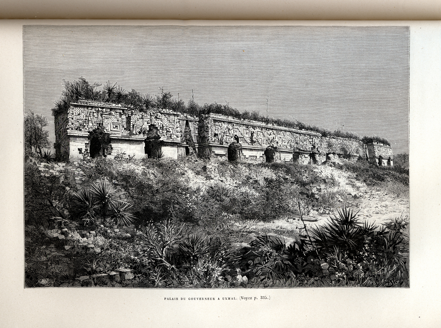 “Palace of the Governor at Uxmal.” Scanned from Charnay, Les anciennes villes du nouveau monde, 1885; closely based on Charnay's 1882 photographs.