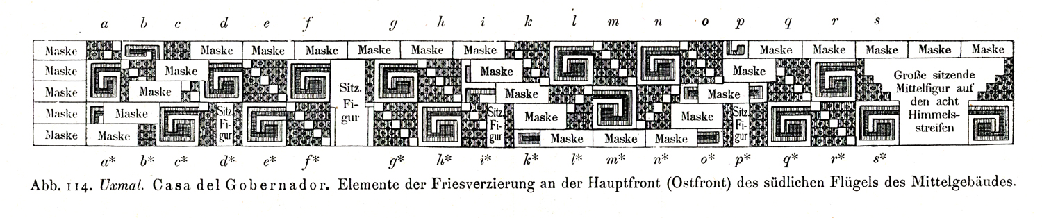 Scanned from Eduard Seler, “Die Ruinen von Uxmal”, 1917 (fig. 114); print closely based on Seler’s on-site drawing.