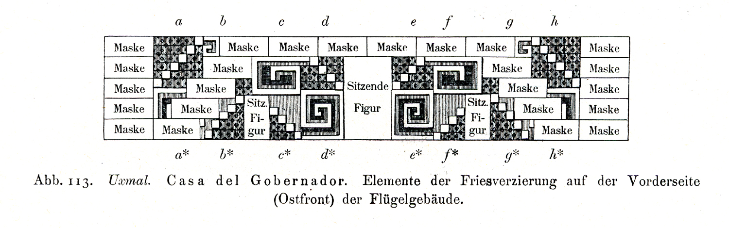 Scanned from Eduard Seler, Die Ruinen von Uxmal, 1917 (fig. 113); print closely based on Selers on-site drawing.