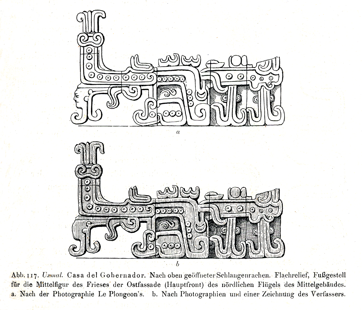 Scanned from Eduard Seler, Die Ruinen von Uxmal, 1917 (fig. 117); closely based on photographs and Selers on-site drawing.
