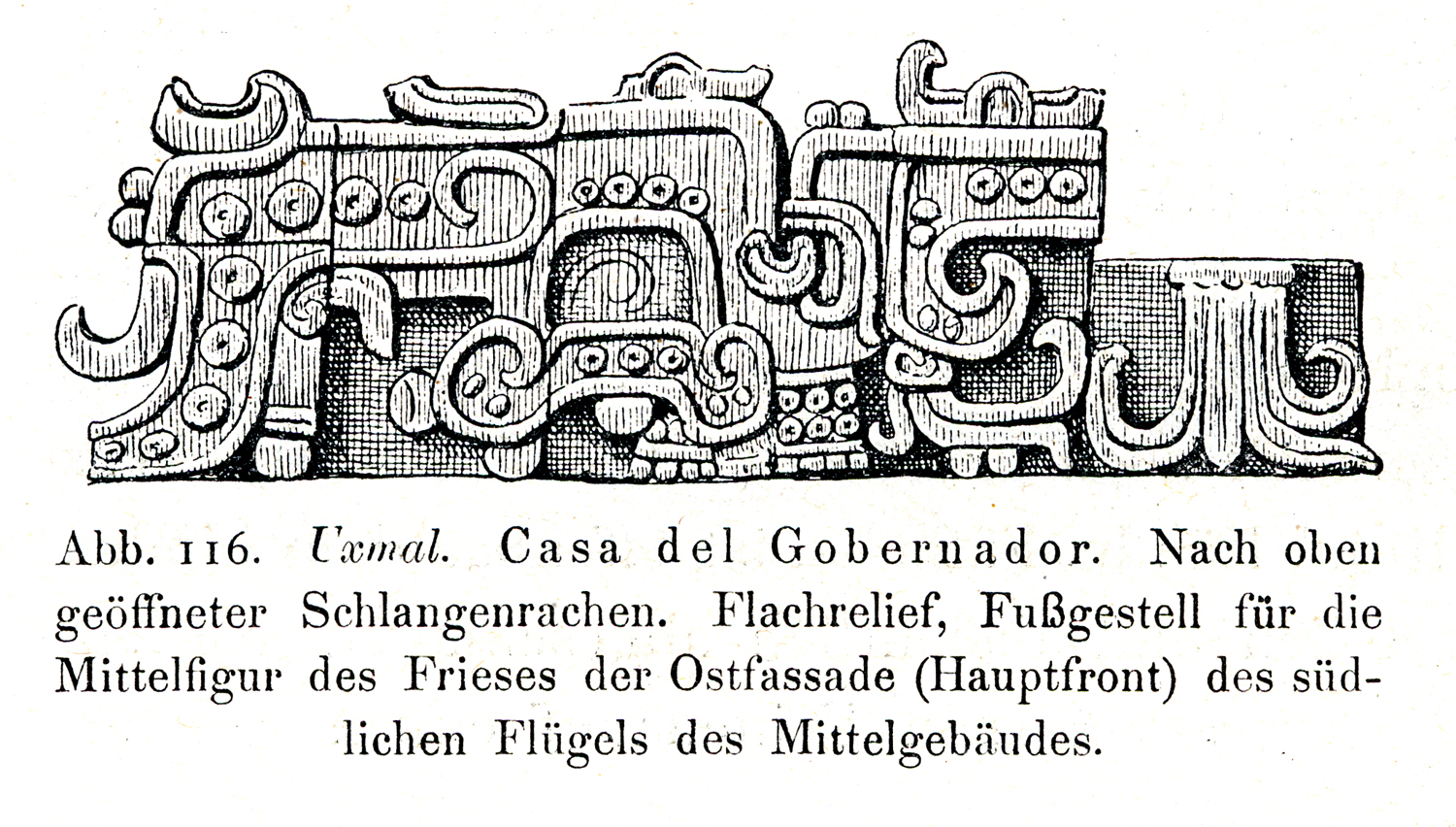"Fig. 116. Uxmal. House of the Governor. Toward opened serpent jaws. Bas-relief, footstand for the middle figure of the frieze of the east facade (main front) of the southern wing of the middle structure."