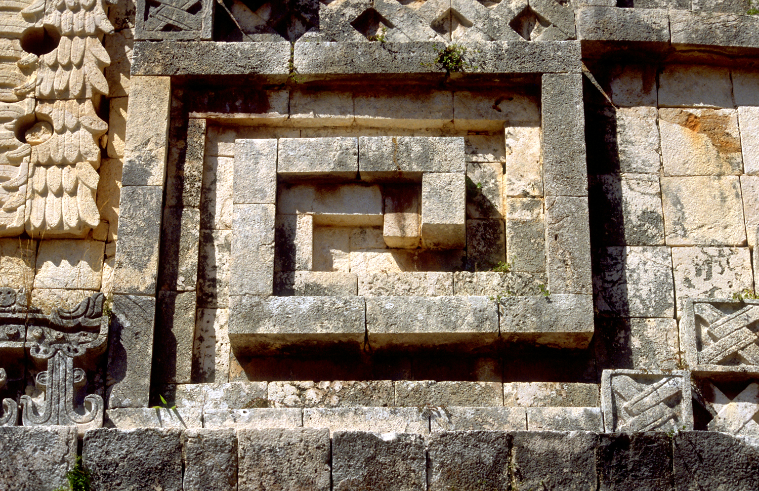Double "G" fret ("meander") near right end of frieze on front of right (north) wing; each fret composed of a flat background and 2 projecting levels. Jan. 2003