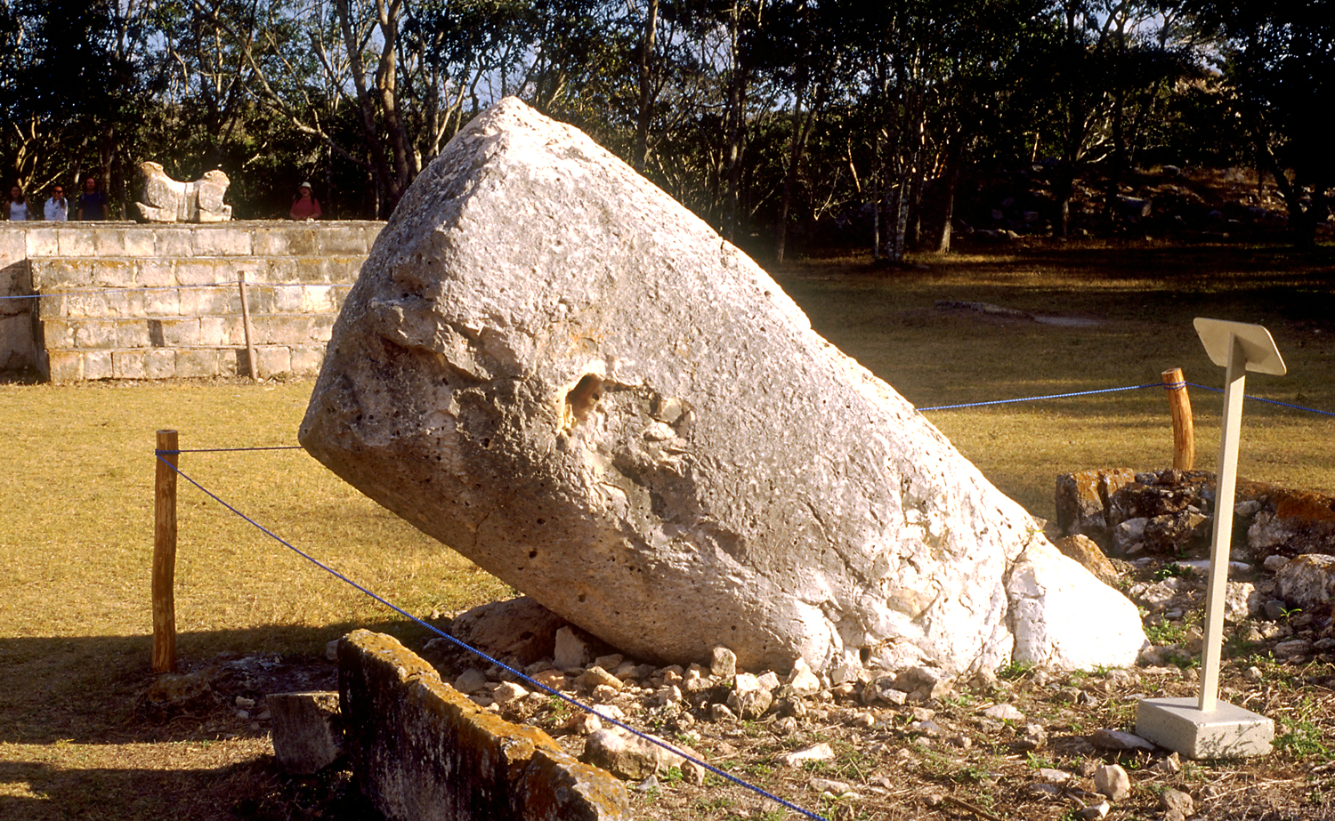 Central monolith in form of inverted cone, badly tilted; presumably the surface was once covered with stucco and painted with symbols and glyphs. Jan. 2002