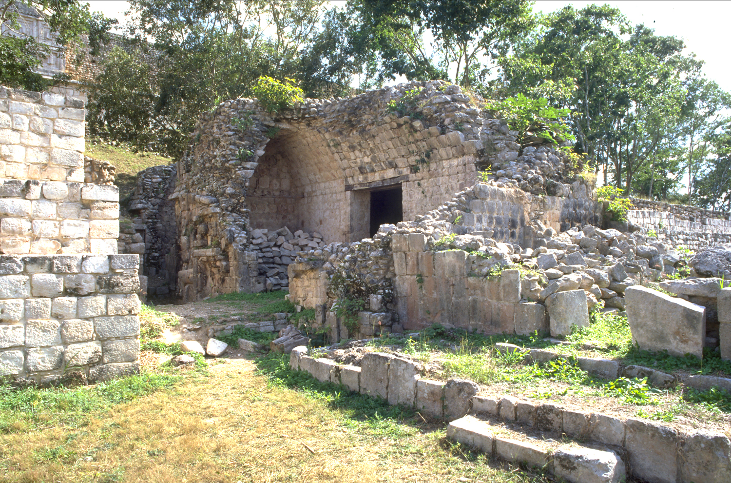 Largely collapsed vaulted room in center, with doorway into back room, and almost totally collapsed room at right with lower portion of doorway and low platform. Jan. 2003 (24 mm lens)