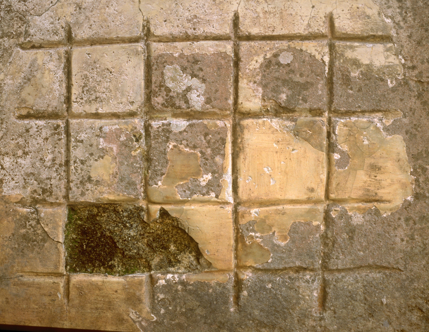 Detail of area in photo at left, showing incised design of simple crossing horizontals and verticals, and some surviving plaster covering. Jan. 2003