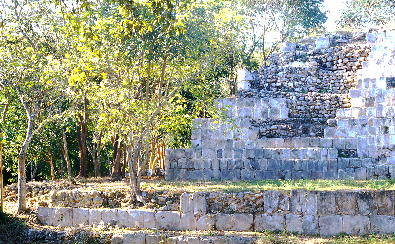 Showing lowest platform in foreground, low with narrow grass terrace on top, and tall section of Great Platform, with several setbacks, above. Jan. 2001
