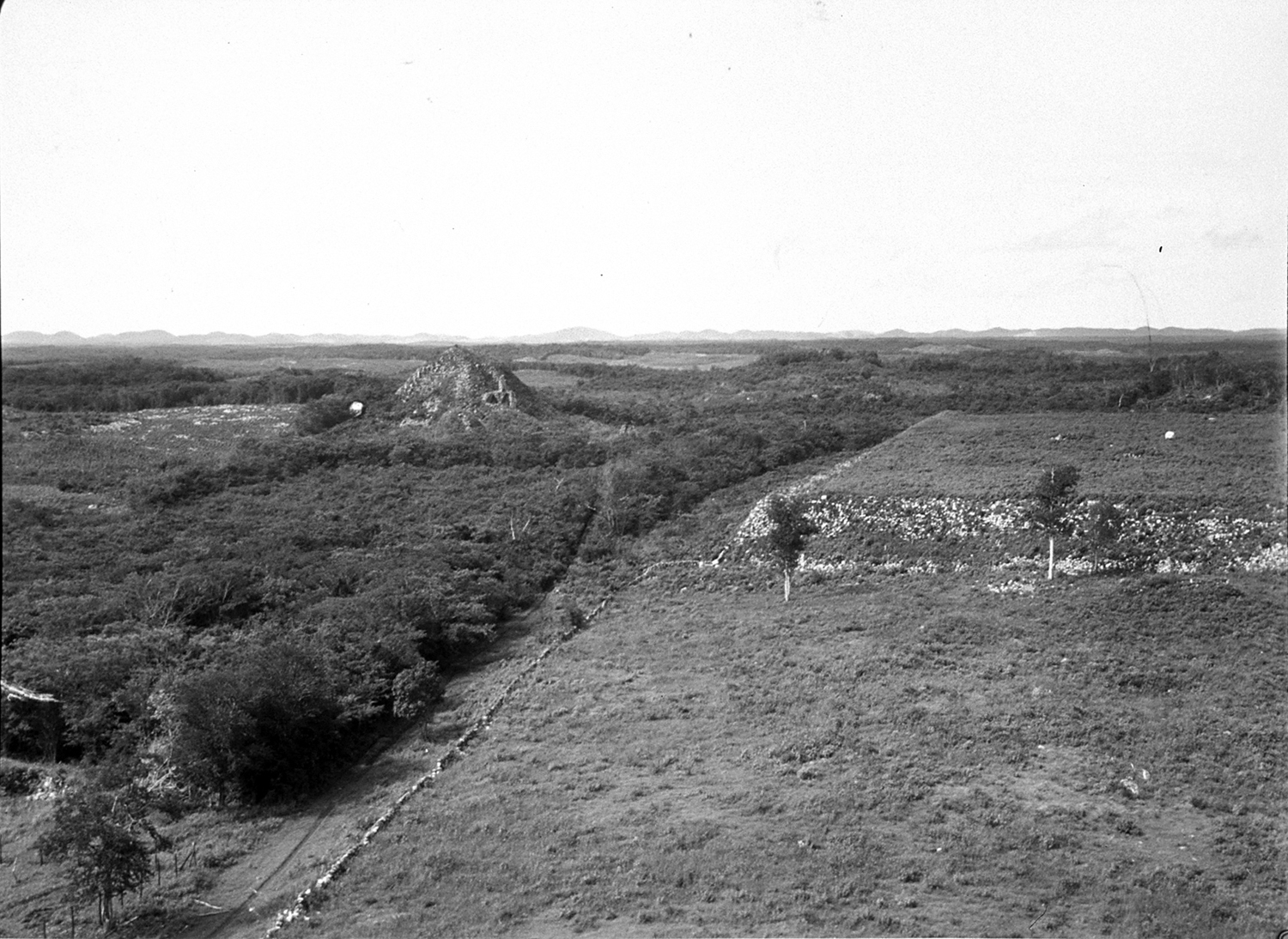 1936. Looking south, from top of Pyramid of the Magician, to Pyramid of the Old Woman, left, and east end of the Great Platform, recently cleared.