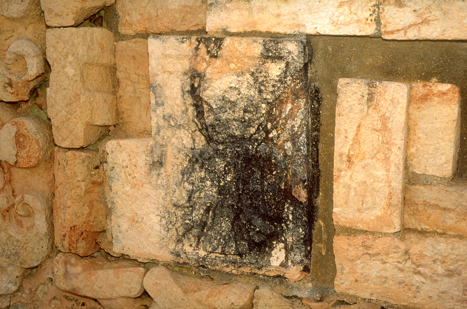 Relief carving of macaw or parrot, badly damaged, presumably by fire.