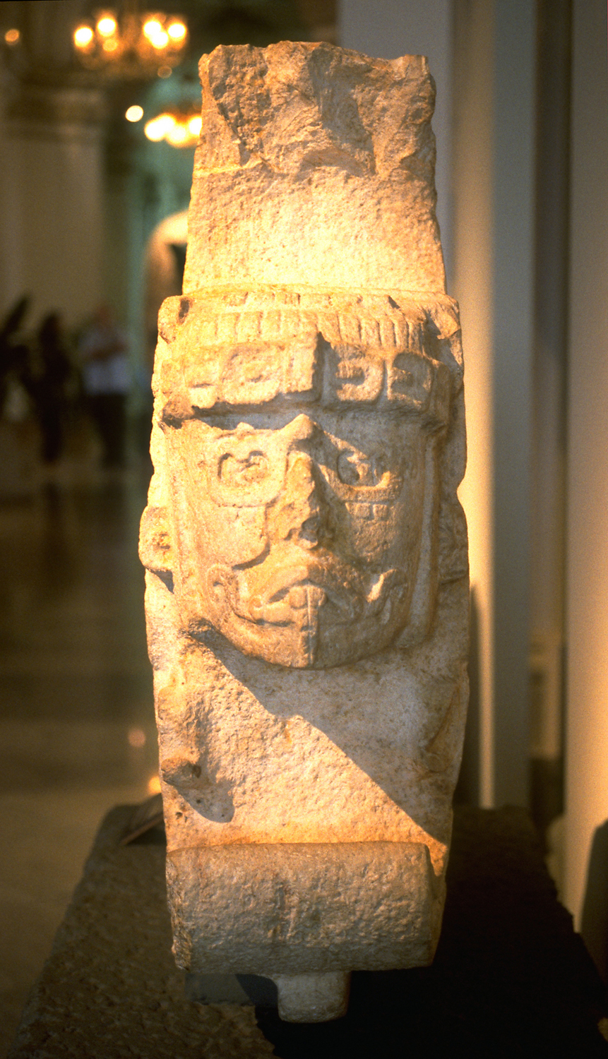 Man's head projecting from open serpent jaws; detail of sculpture at left; discovered in 1968-69 in debris on south side of Pyramid of the Magician's Jan. 2002