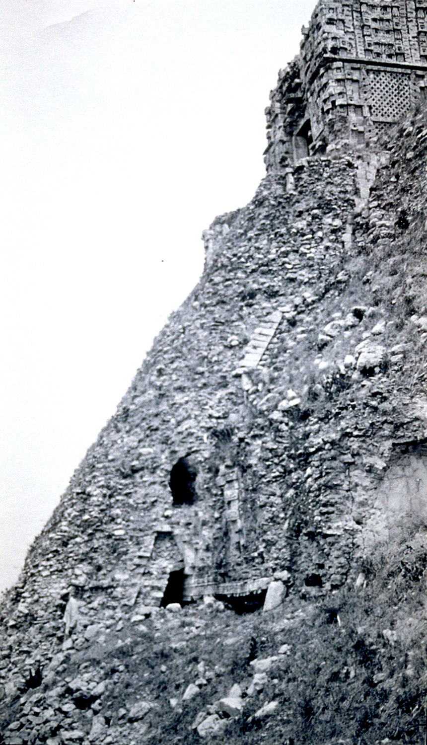 Feb. 1923. West face: right side of staircase with Temple IV at top. Scanned from slide taken of original photograph by M. H. Saville; reproduced Courtesy of The Division of Anthropology, American Museum of Natural History.
