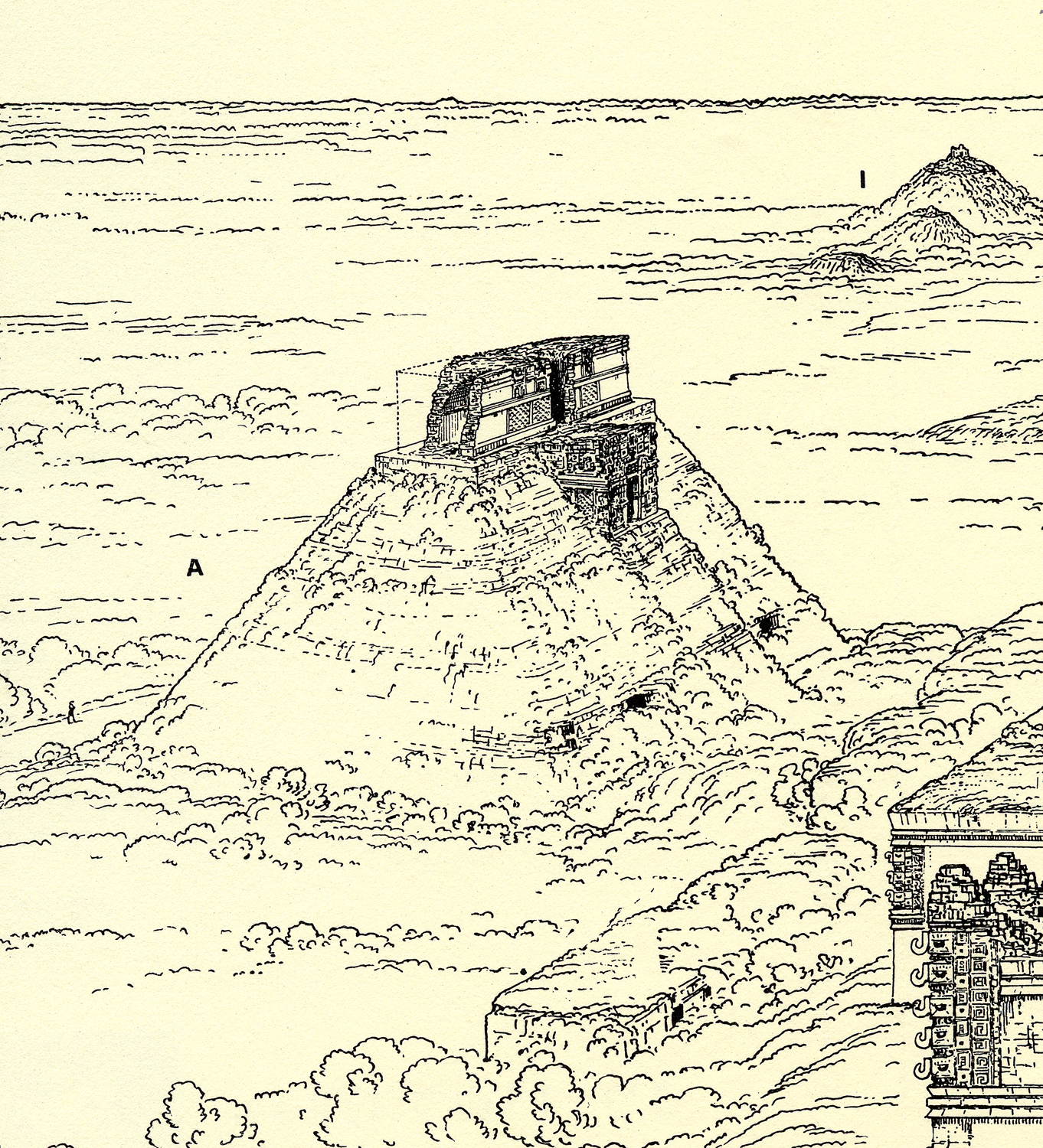 1895. Detail from panoramic print of Uxmal; suggesting that ends of Pyramid were partly flat instead of rounded.