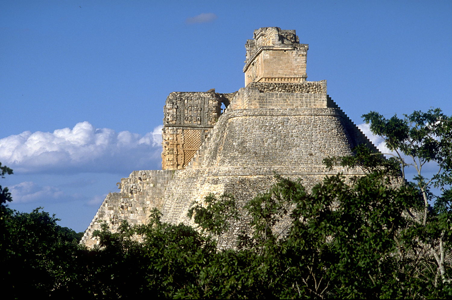 South end of Pyramid, showing both grand staircases, the west staircase steeper, also showing passage behind Temple IV.