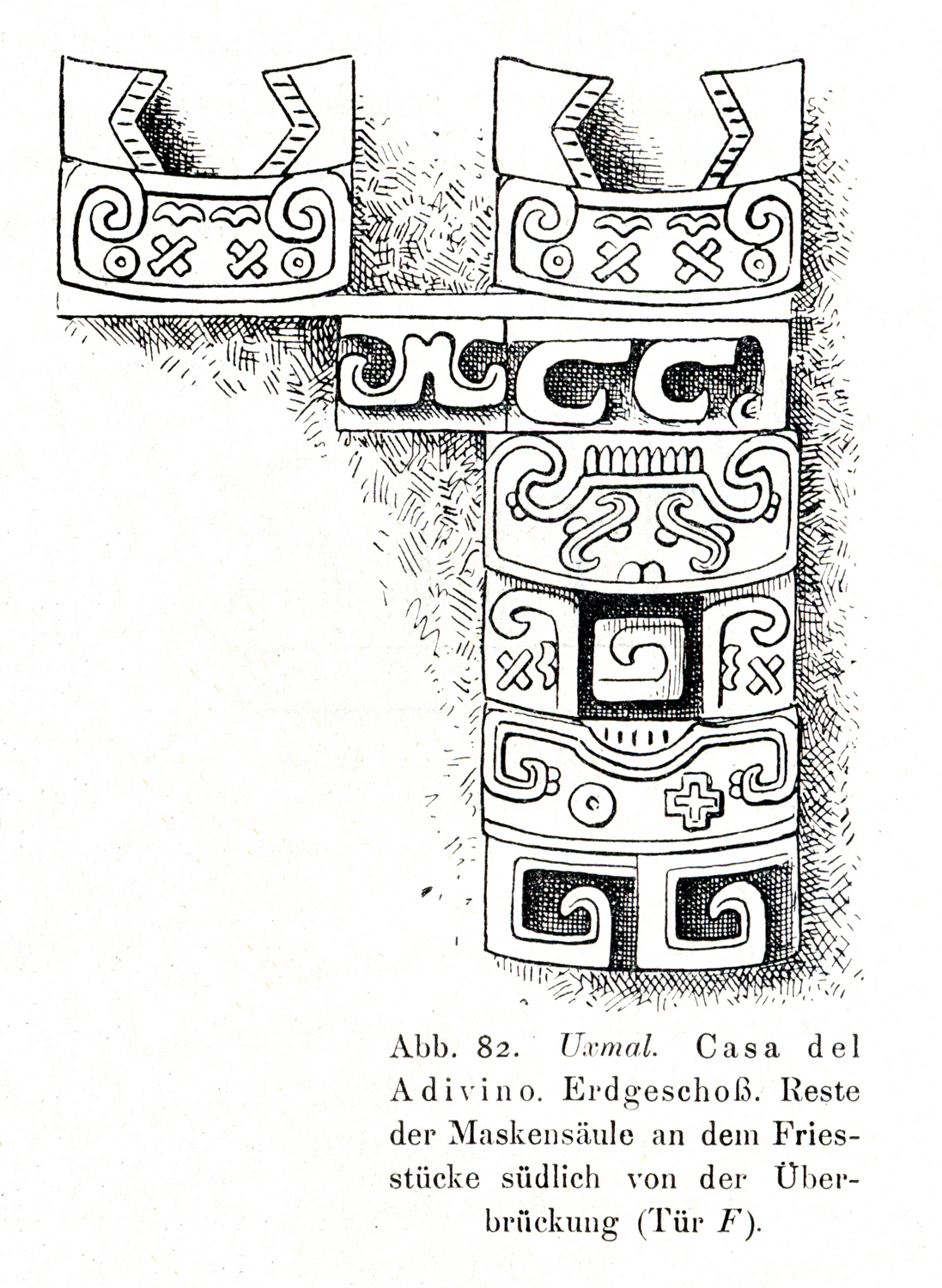 "Fig. 82 Uxmal. House of the Magician. Ground floor. Remnants of the mask column on the frieze piece south of the bridging (door F)." (cf. photo at left).