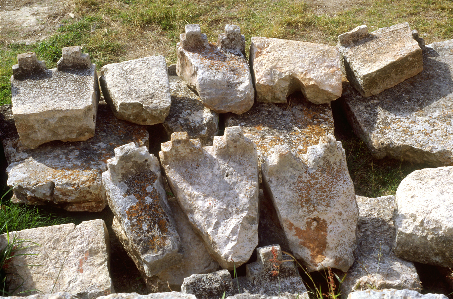 Bottoms facing up, showing deep tenons of unbroken stones and protruding dentils.
