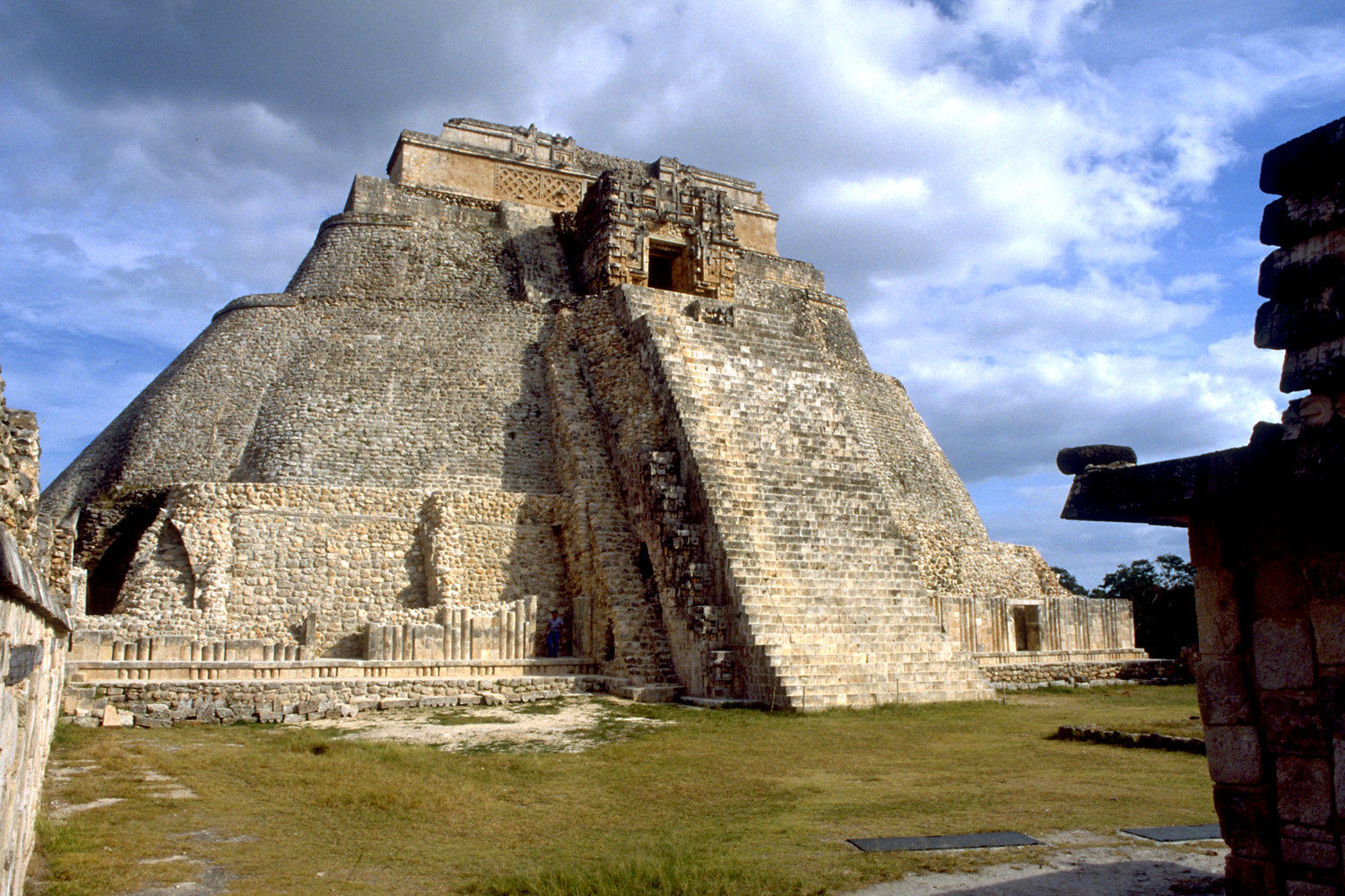Pyramid of the Magician (Adivino), west front, after major restorations of 20th century. Jan. 2003 (24mm lens)