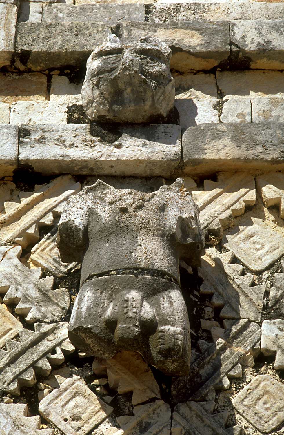 Naked male figure with short sticks through skin of penis and thigh, a jaquar head as headress, entirely restored.
