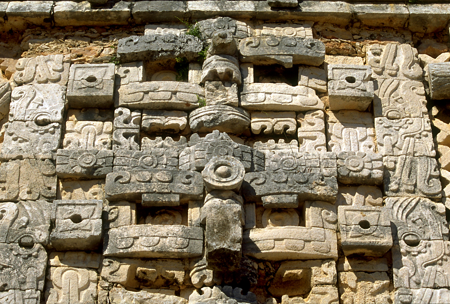 Detail of upper 2 masks in stack shown in photo at left; framed on both sides with reliefs of serpent heads in profile with hanging bifurcated tongues.