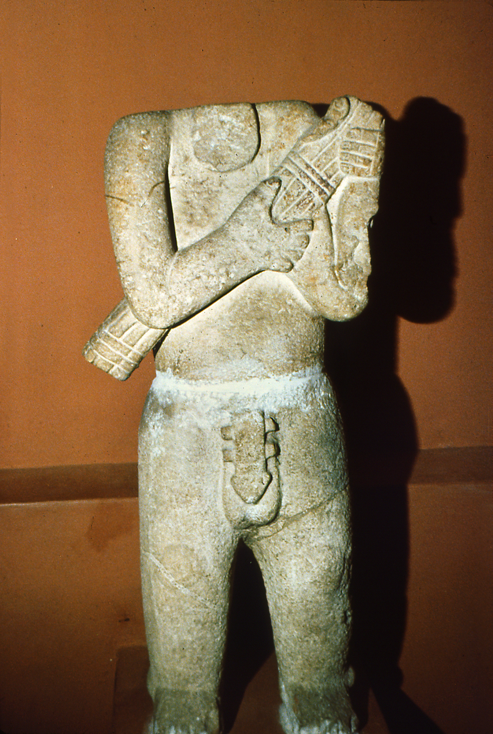 Figure said to be from facade of West Building. This well preserved figure indicates how other facade sculpture may have been finished. It is slightly more naturalistically shaped than its counterpart, more than any other sculpture at Uxmal. Note also the articulated fingernails. |
