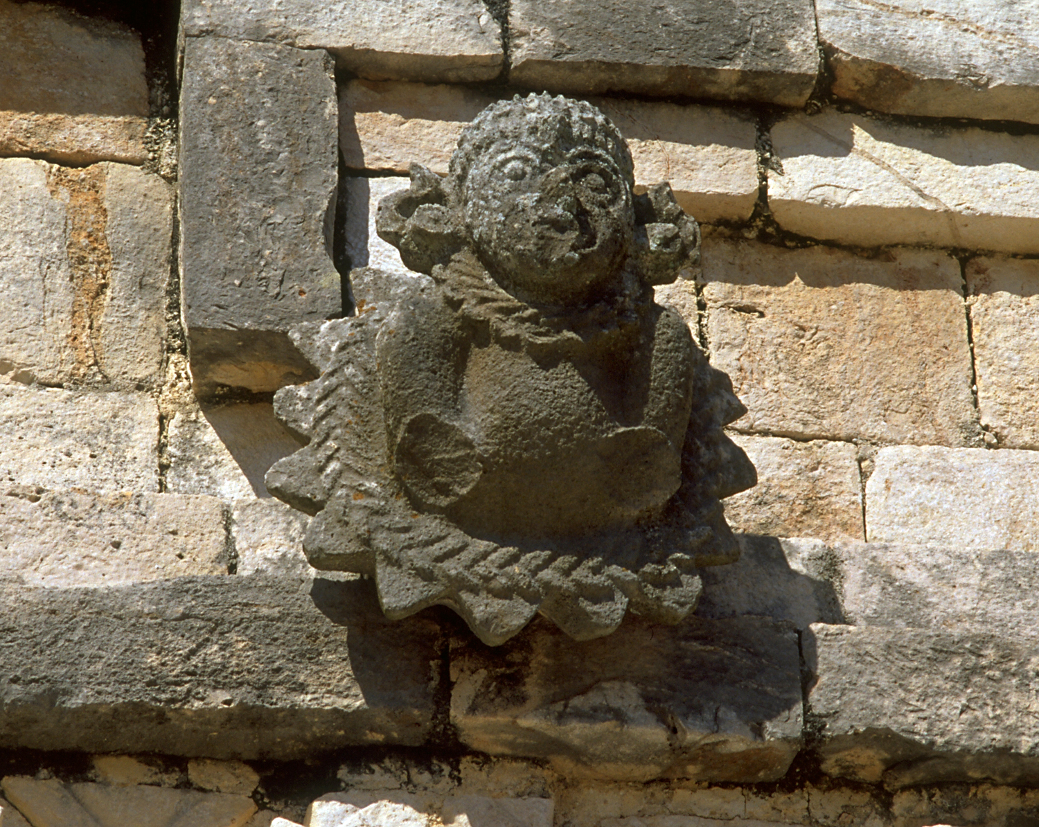 Detail of sculpture medalion in photo in top row, far-left; showing a god emerging from a flower.
