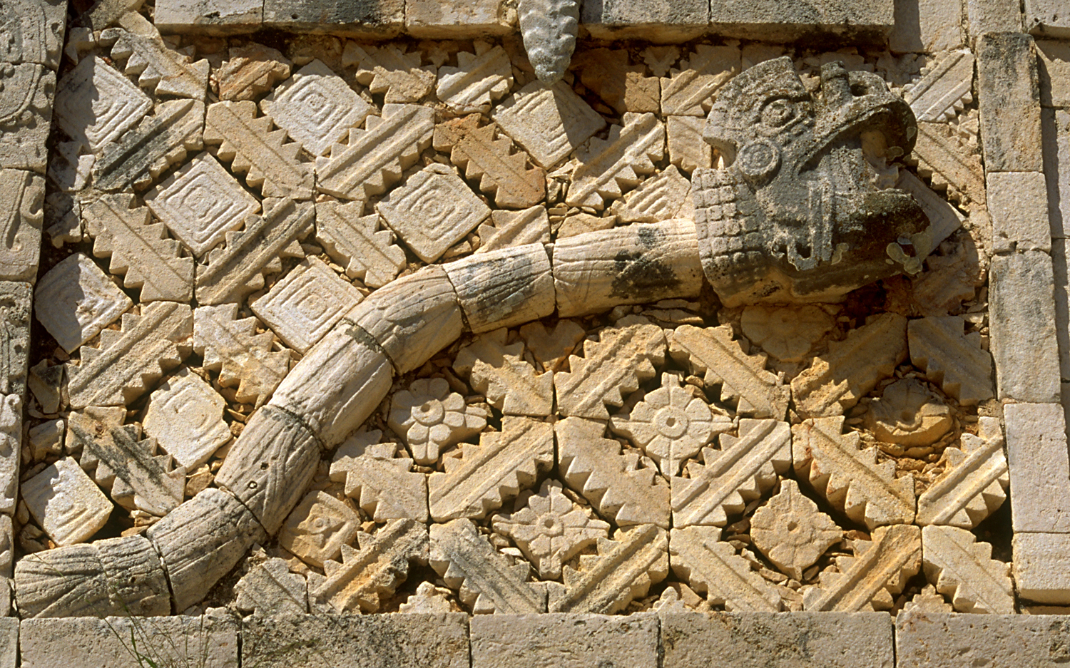 Section of serpent within this enclosing rectangle of frieze; also showing background of serrated latticework and enclosed motifs, some of flowers.