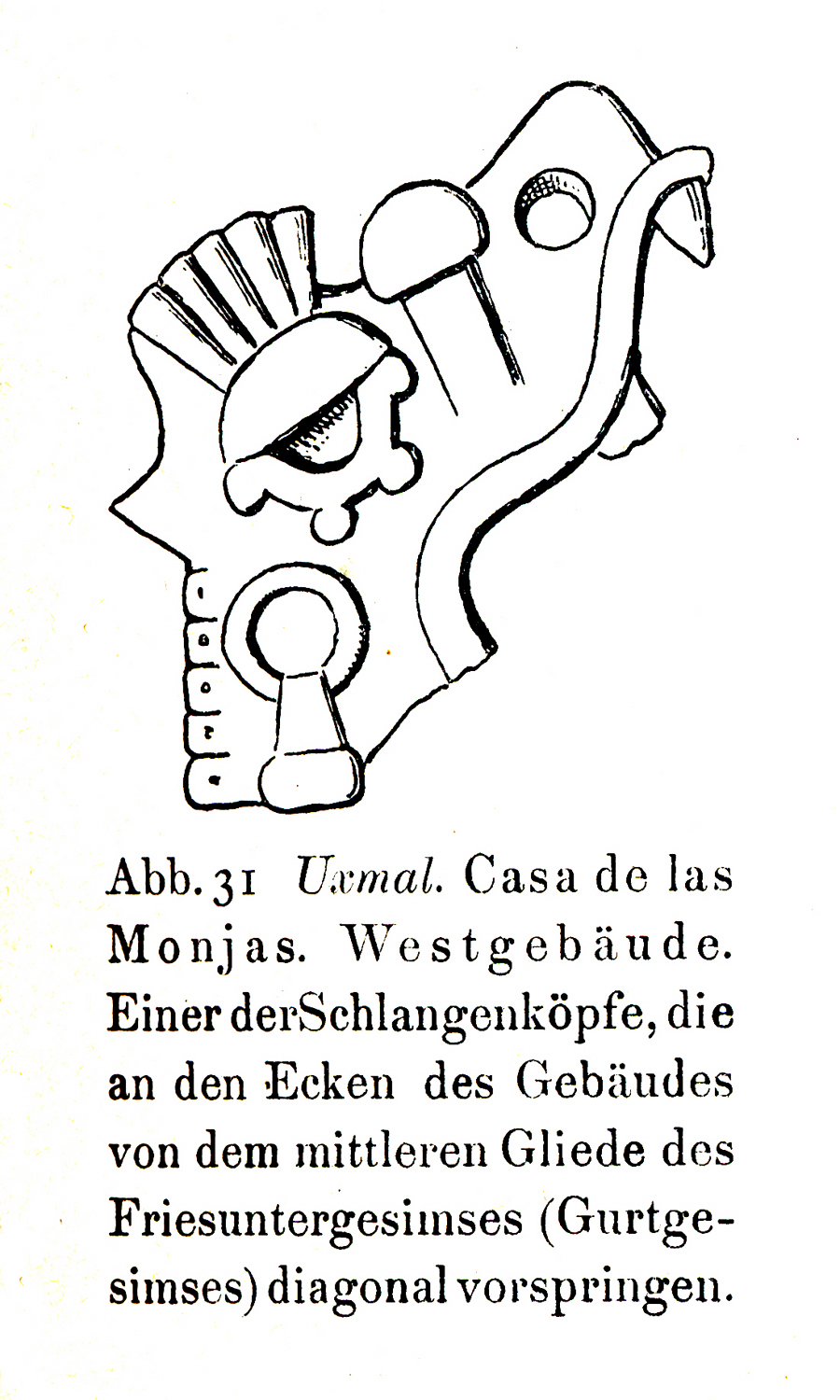 "Fig. 31. Uxmal. House of the Nuns. West building. One of the serpent heads at the corner of the building that extend diagonally from the