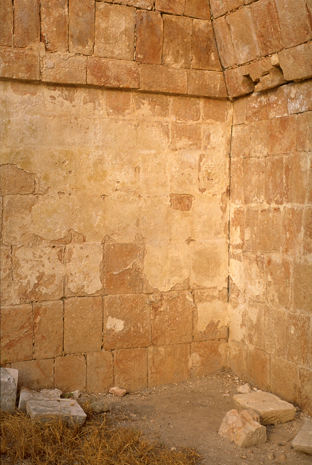 Interior of room in photo at left, showing circular depressions to support ends of beams