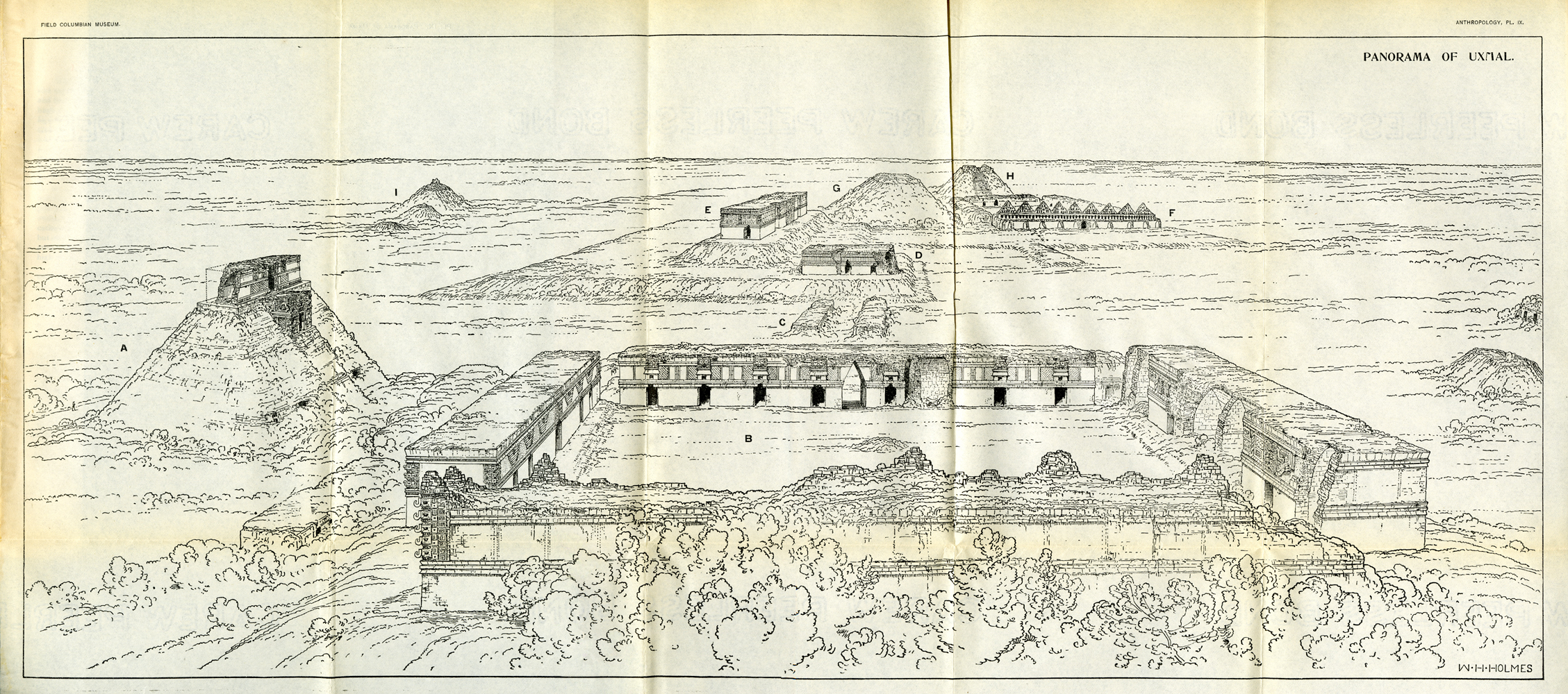 "Panorama of Uxmal" (looking south over Nunnery Quadrangle); long foldout print of drawing by W.H. Holmes. Published in W.H. Holmes, Archaeological Studies among the Ancient Cities of Mexico, 1895; foldout print following p.96.