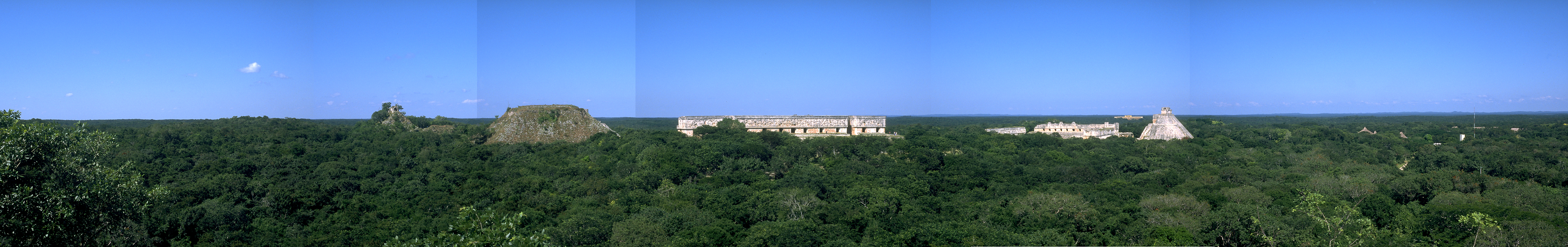 Panorama of Uxmal from Pyramid of the Old Woman, looking south-west to north-east; showing typical low forrest and (left to right) South Temple, Great Pyramid, Governor's Palace, Nunnery Quadrangle, and Pyramid of the Magician (buildings in distance and at right are recent hotels and lodges). |