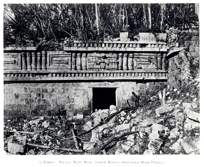 "Pl.10, No.1. "Labna: Palace, West Wing, Lower Range; Simplified Mask Panels."   1888-1891/1913