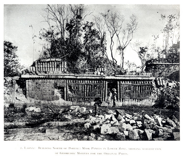 Pl.10, No.2. "Labna: Building North of Portal; Mask Panels in Lower Zone, showing substitution of Geometric Motives for the Original Parts."   1888-1891/1913