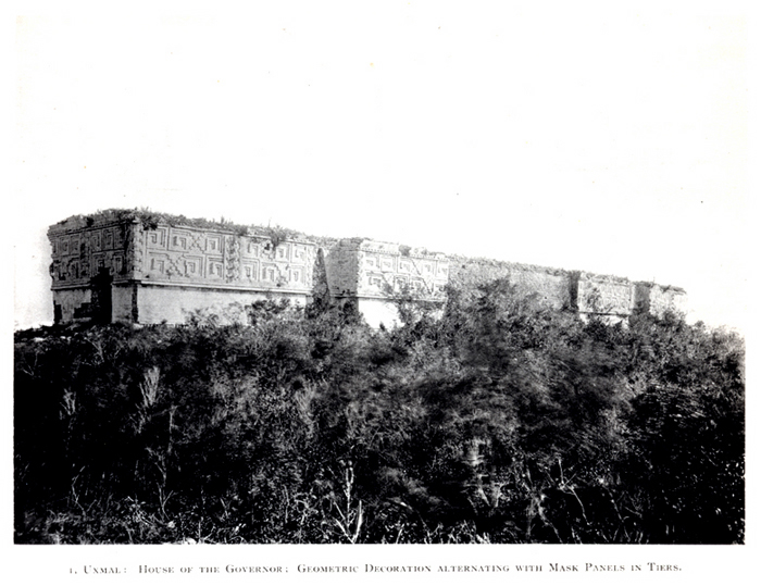 Pl.14, No.1. "Uxmal: House of the Governor; Geometric Decoration alternating with Mask Panels in Tiers."   1888-1891/1913