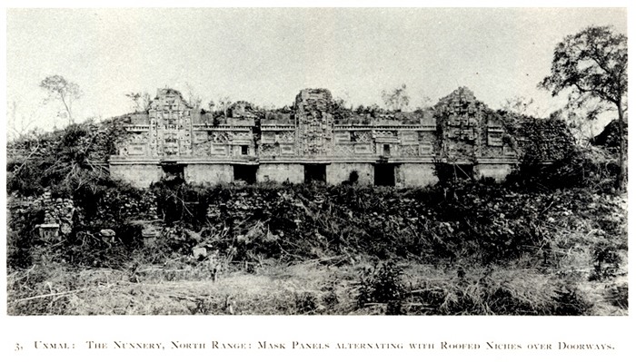 Pl.16, No.3. "Uxmal: The Nunnery, North Range; Mask Panels alternating with Roofed Niches over Doorways."   1888-1891/1913