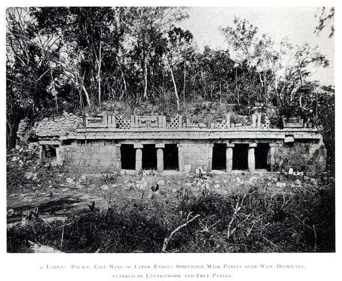 Pl.9, No.2. "Labna: Palace, East Wing of Upper Range; Simplified Mask Panels over Wide Doorways, flanked by Latticework and Fret Panels."   1888-1891/1913