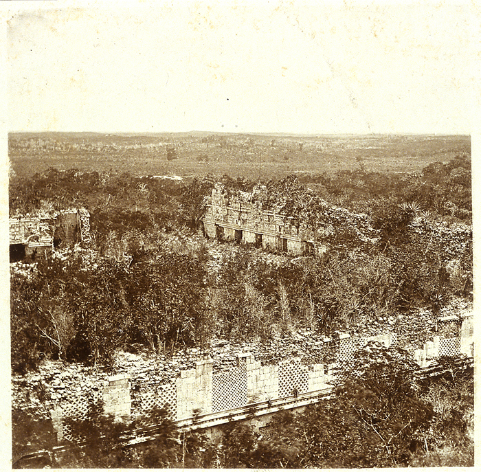 Uxmal: Nunnery Quadrangle, looking past back of East Building to fronts of West and North Buildings, from Pyramid of the Magician.   ca.1873  (96.R.137-461)