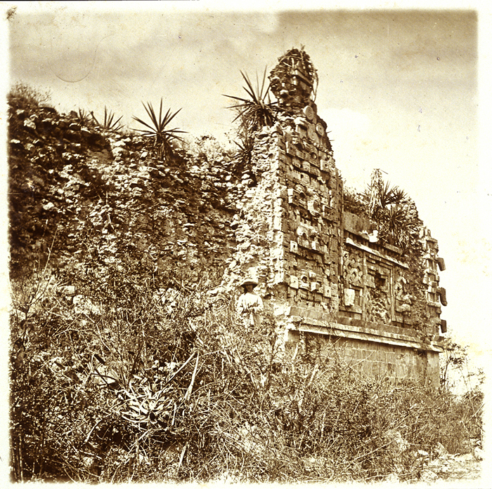 Uxmal: Nunnery Quadrangle, North Building, right end of front facade. Alice Dixon Le Plongeon standing near center.   ca.1873 (96.R.137-458)