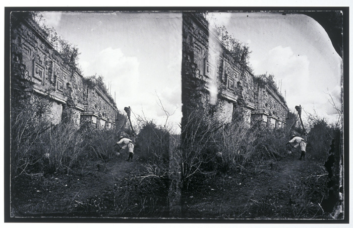 Augustus Le Plongeon photographing the frieze of the Governor's Palace, Uxmal, from a ladder, a Maya assistant in the foreground. Stereo photograph by Alice Dixon LePlongeon.   ca. 1873 (2004.M.18-b15.19)
