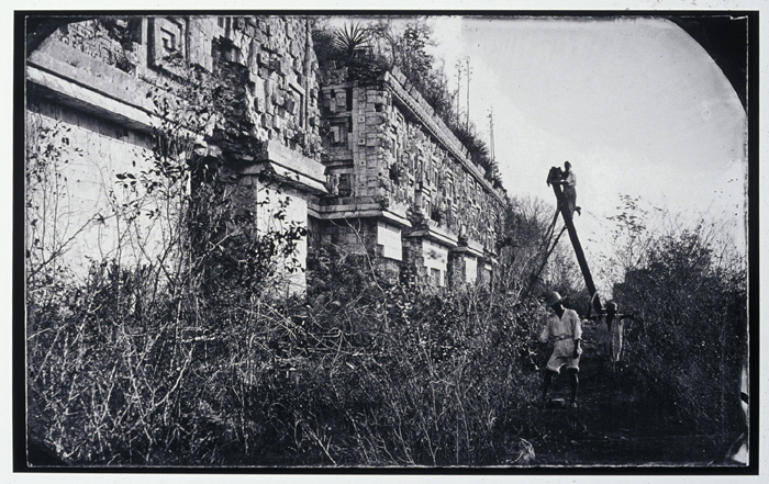 Augustus Le Plongeon photographing the frieze of the Governor's Palace, Uxmal, from a ladder, a Maya assistant in the foreground. Photograph by Alice Dixon LePlongeon.   ca. 1873 (2004.M.18-b15.18)