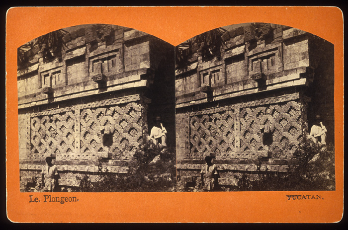 Uxmal: Pyramid of the Magician, front facade of Temple V, Maya assistant and Alice Dixon Le Plongeon; albumen cabinet stereo photograph.   ca.1876 (2004.m.18-b12.80)