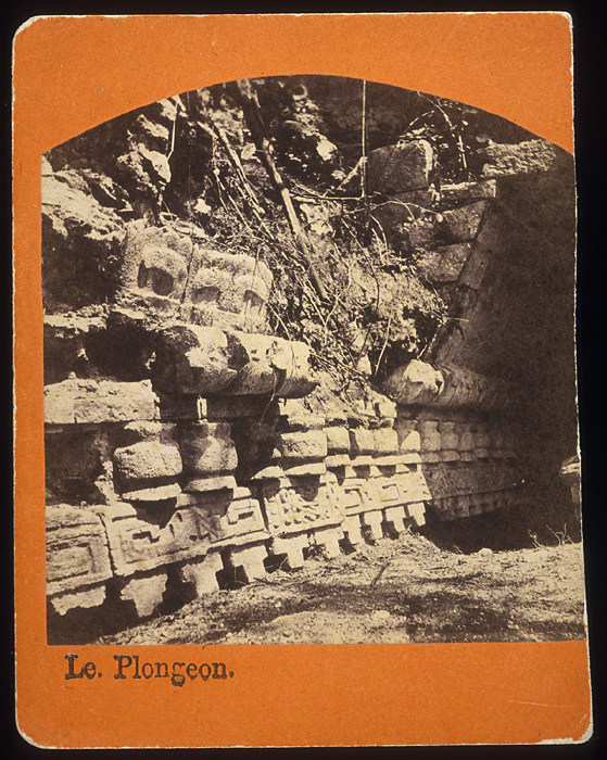 Uxmal: Pyramid of the Magician; base of west facade of Temple I and vaulted passageway under staircase added for Temple IV.   ca.1876 (2004.m.18-b12.69)