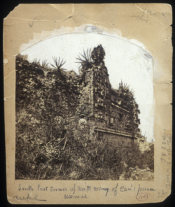 Uxmal: Nunnery Quadrangle, North Building; east end of front facade; showing rubble-concrete core and well-preserved portion of facade with mask stacks; Alice Dixon Le Plongeon standing.   ca.1876 (2004.m.18-b12.45R)