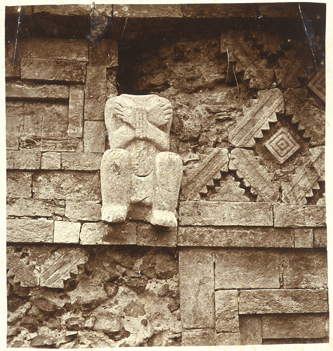 Uxmal: Nunnery Quadrangle, North Building; naked bound captive, hands bound across his chest, rope around neck hangs down over stomach, testicles at bottom, penis erect; on frieze between 3rd and 4th doorways from left.