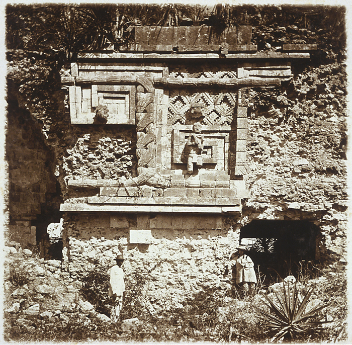 Uxmal: Nunnery Quadrangle, West Building, front (east) facade; section between 2nd and 3rd doorways from left; including standing figure wearing loincloth and cape, holding staff across chest. Maya assistant and Alice Dixon Le Plongeon.
