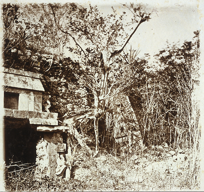 Uxmal: Nunnery Quadrangle, South Building, northwest corner, partly collapsed. Alice Dixon Le Plongeon in foreground.   ca.1873 (96.R.137-460)