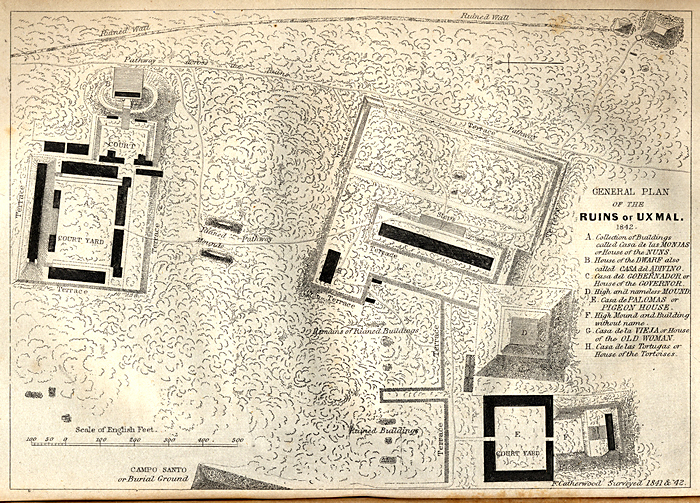Vol.I, facing p.165: "General Plan of the Ruins of Uxmal, 1842 / F. Catherwood Surveyed 1841 & '42".   1843