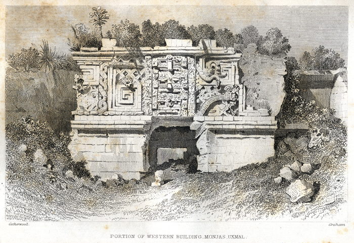 Vol.I, facing p.302: "Portion of Western Building, Monjas, Uxmal / Catherwood, Graham.   1843