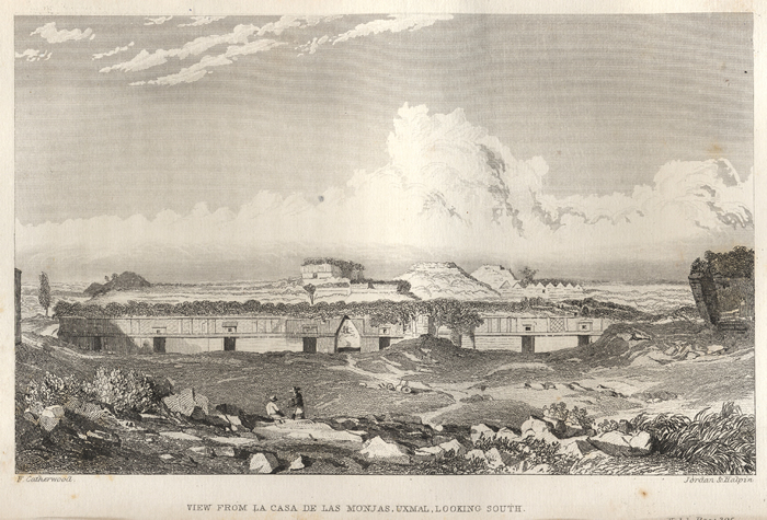Vol.I, facing p.304: "View from La Casa de las Monjas, Uxmal, Looking South / F. Catherwood, Jordan & Halpin".   1843