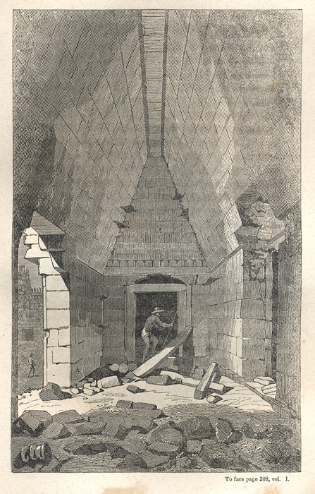 Vol.I, facing p.308: "East Building, Casa de las Monjas, Uxmal, Room inside Central Doorway".       1843