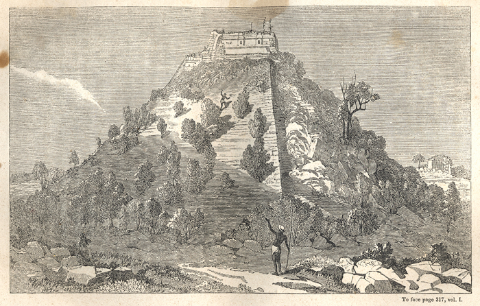 Vol.I, facing p.317: "Eastern Front of the House of the Dwarf, Uxmal".   1843