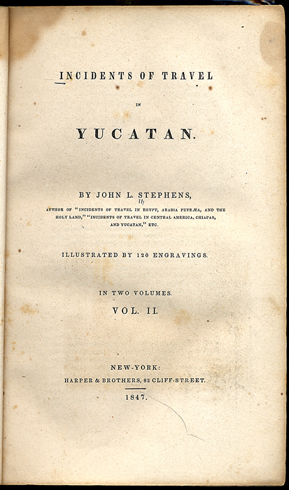 Title Page, Vol.II. "Incident of Travel in Yucatan. By John L. Stephens. Illustrated by 120 Engravings."   1843