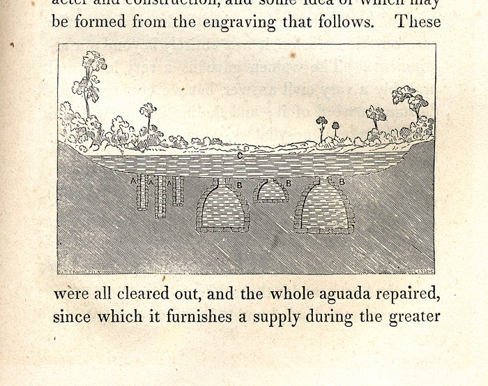 Vol.II, p.227: Aquada at rancho of Jalal, hypothetical cross-section of six of some forty wells discovered, cleared out and repaired by local inhabitants ten years previous, based on local reports.   1843